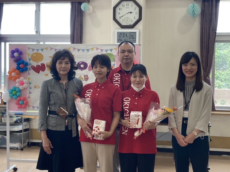 職員より二人へ花束と琉球ガラスのコップをプレゼントしました。