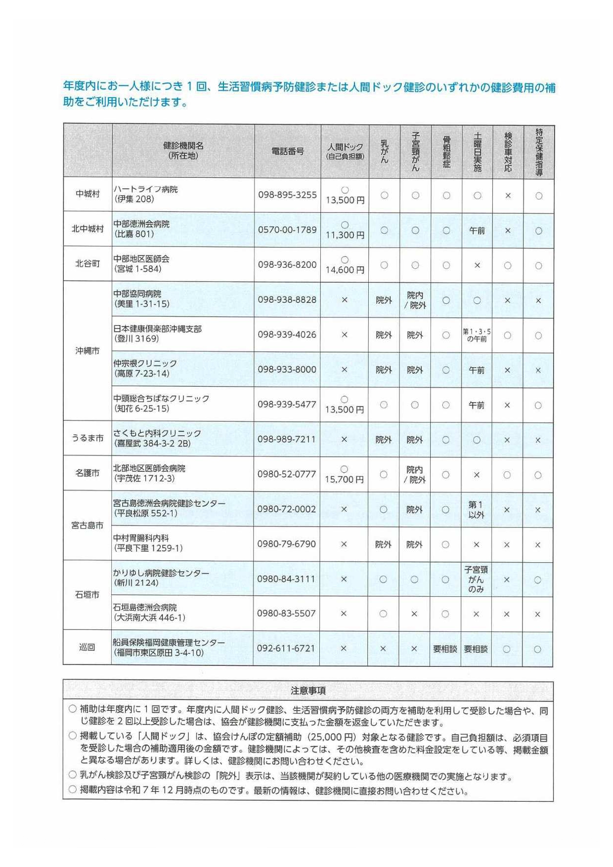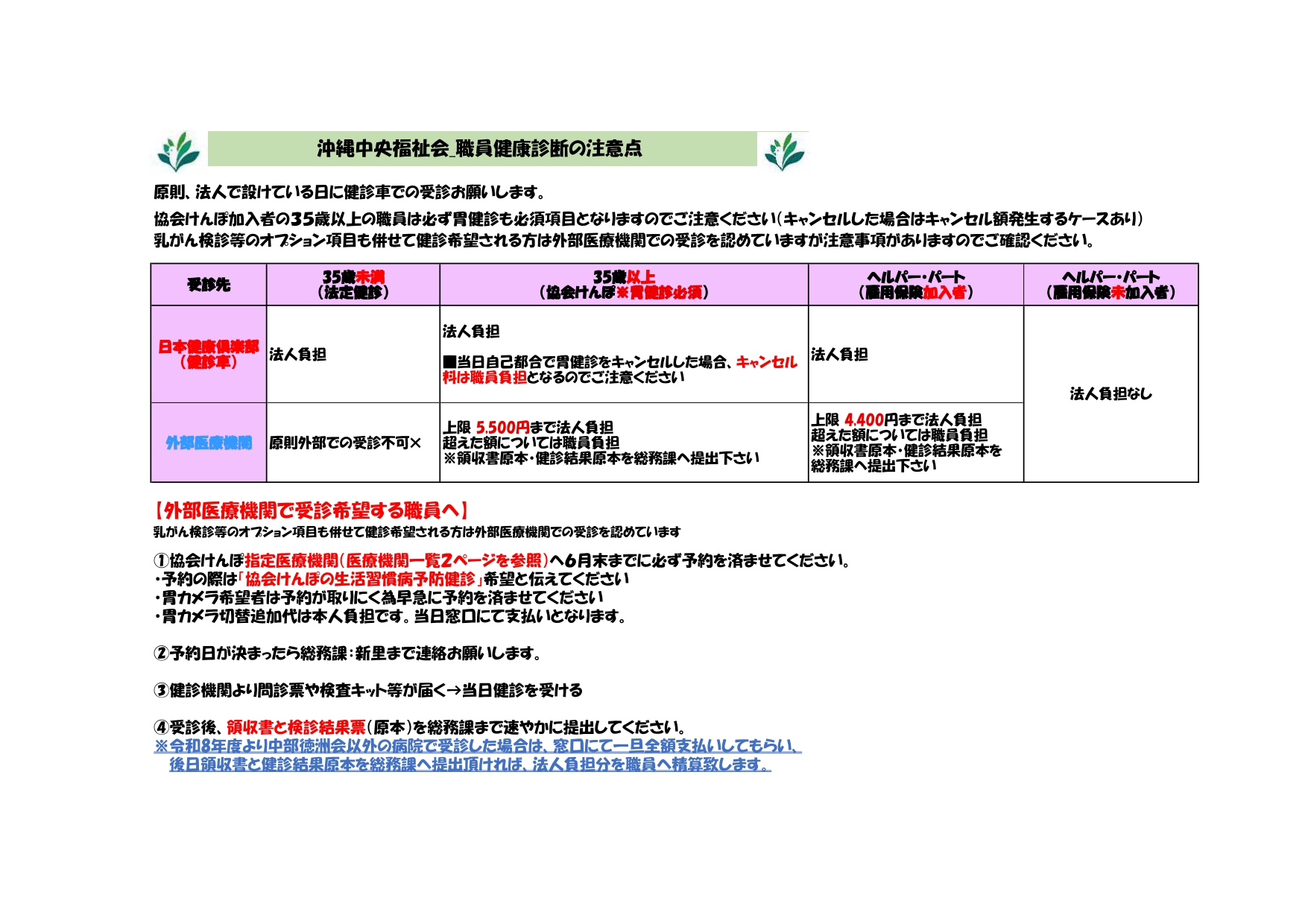 また今年度より外部医療機関(中部徳洲会病院以外)で受診する際は、窓口で職員が一旦全額負担いただき、後日会社へ領収書と検診結果(原本)を提出ください。会社負担分を精算いたします。
