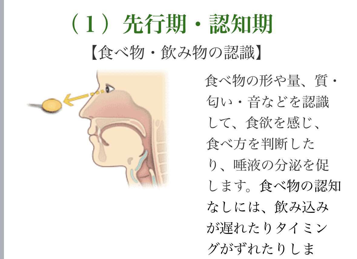 生活の中でも一番の楽しみである食事を安全に提供するために勉強しました。特に先行期(認知期)では目や耳、鼻を使って食物を認識するので、私たちの腕の見せどころです。